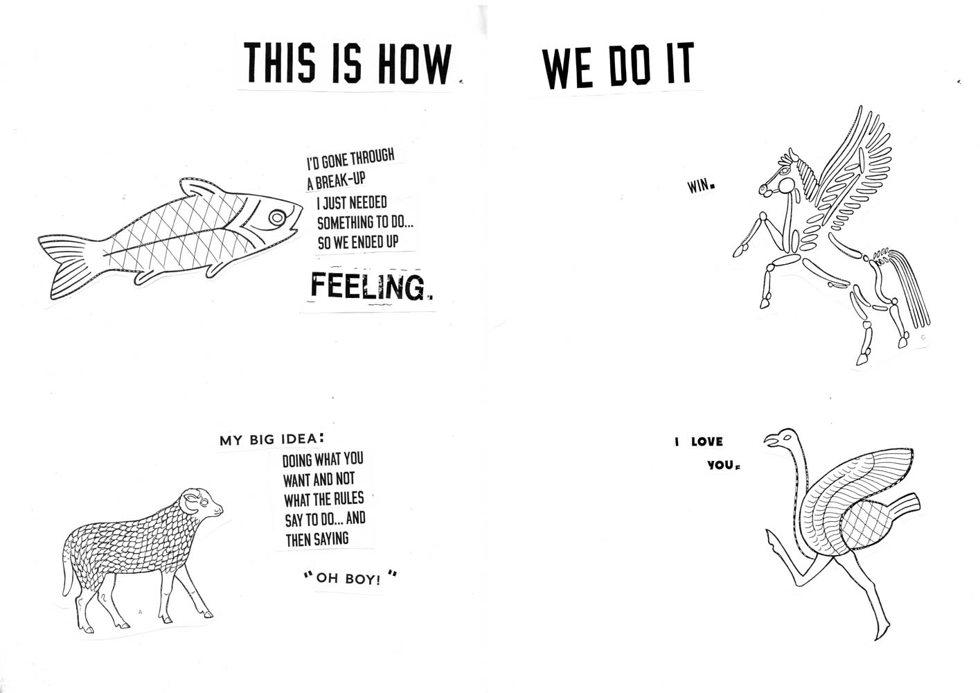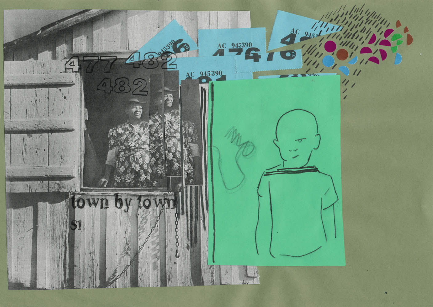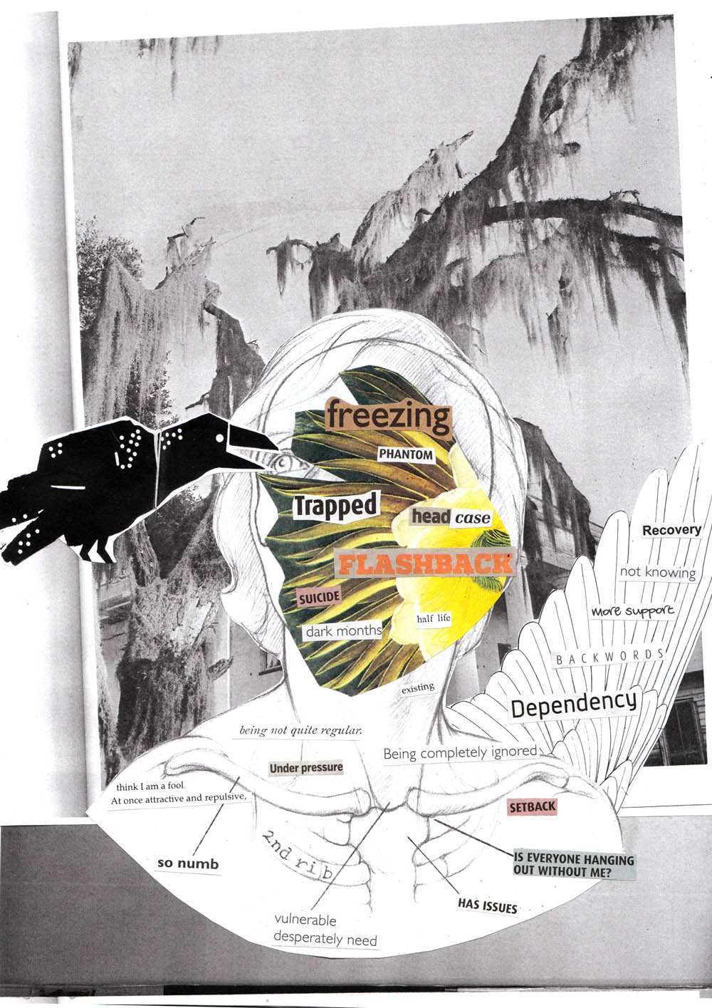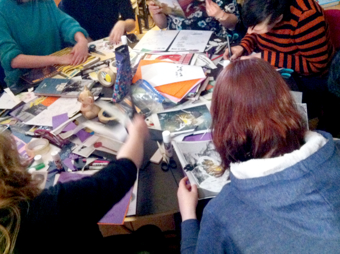Set back behind the curtains of the Theatre Deli cafe; a circular table, in the center of a little grotto-like environment with lamps, drapes, curtains and plenty to do. People began arriving from 12:00pm, on the dot, right up until the very end of the session. There was no need to attend the full session but everyone stayed until they’d created a collage and had a good chat. There were 10 of us in total, cutting sticking and chatting. Most who attended made amazing collages, some just came along to draw, talk and listen. I think we all worked as good catalysts to one another’s conversation and creativity.