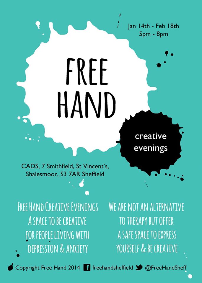 Free Hand Creative Evenings are a Sheffield based community project ran by Charly Calpin. Free Hand provides space and expertise for people with depression and anxiety to be creative. The workshops are based at CADS (Creative Arts Development Space), a multi-purpose arts complex in Sheffield with studios for rent, space for hire. I was contacted a few weeks ago by Charly of Free Hand about collaborating on some of her evenings. Charly puts on Free Hand Creative Evenings every Wednesday for a run of 6 weeks at a time, only usually having a break of a single week for further planning and preparation! She is very modest but has inspired me no-end! I’ve met with Charly a couple of times now and i’m absolutely made up that she’s interested in collaborating with us. We’re beginning to pin down a collaborative workshops that will be held on the 13th of May. Watch this space! In the meantime make sure you checking out Free Hand Creative Evenings, there’s something different and brilliant every time! Also Charly posts lots of really great and useful discussions and articles on Mental Health.