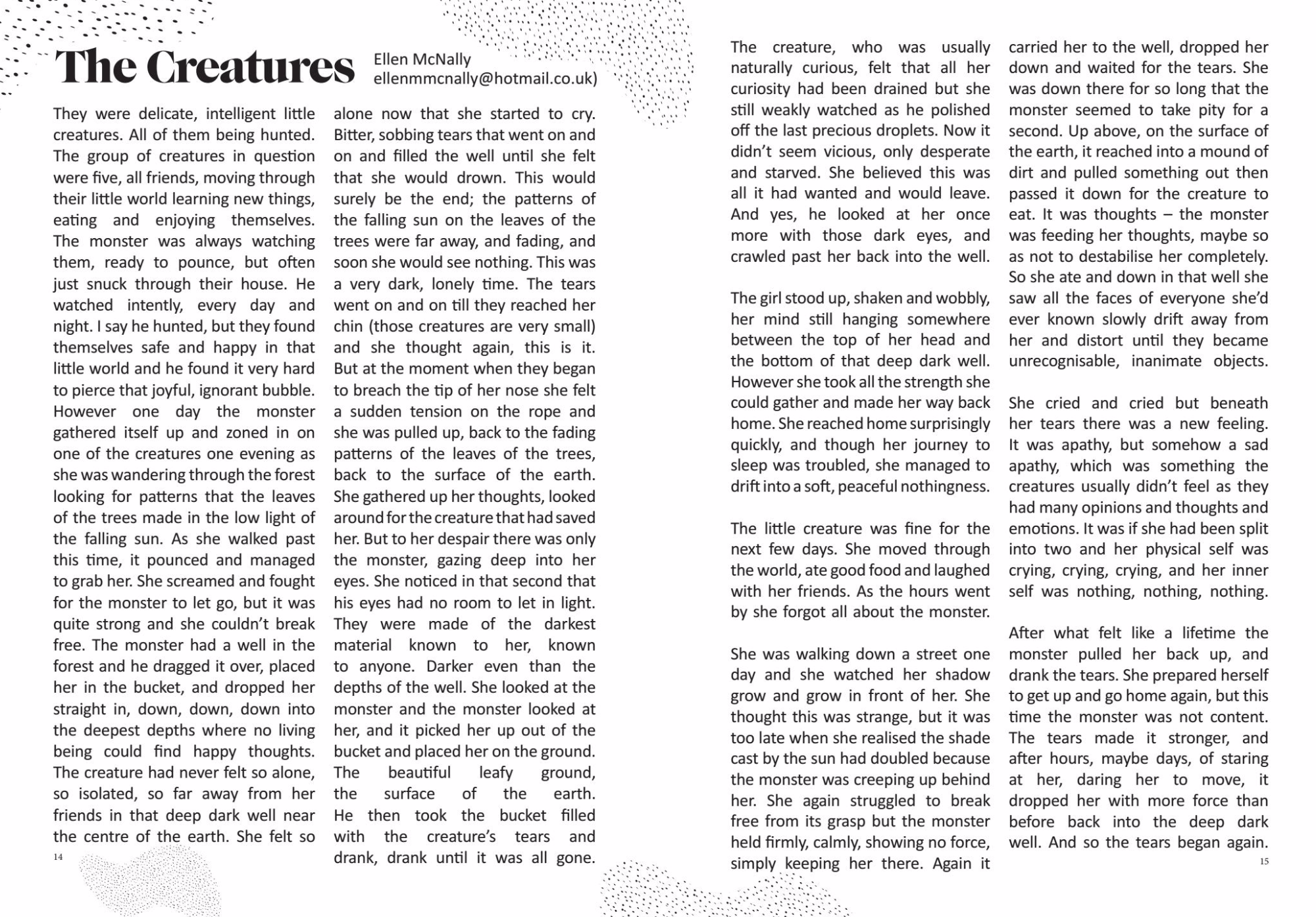 She was walking down a street one day and she watched her shadow grow and grow in front of her. She thought this was strange, but it was too late when she realised the shade cast by the sun had doubled because the monster was creeping up behind her. She again struggled to break free from its grasp but the monster held firmly, calmly, showing no force, simply keeping her there. Again it carried her to the well, dropped her down and waited for the tears. She was down there for so long that the monster seemed to take pity for a second. Up above, on the surface of the earth, it reached into a mound of dirt and pulled something out then passed it down for the creature to eat. It was thoughts – the monster was feeding her thoughts, maybe so as not to destabilise her completely. So she ate and down in that well she saw all the faces of everyone she’d ever known slowly drift away from her and distort until they became unrecognisable, inanimate objects. She cried and cried but beneath her tears there was a new feeling. It was apathy, but somehow a sad apathy, which was something the creatures usually didn’t feel as they had many opinions and thoughts and emotions. It was if she had been split into two and her physical self was crying, crying, crying, and her inner self was nothing, nothing, nothing. After what felt like a lifetime the monster pulled her back up, and drank the tears. She prepared herself to get up and go home again, but this time the monster was not content. The tears made it stronger, and after hours, maybe days, of staring at her, daring her to move, it dropped her with more force than before back into the deep dark well. And so the tears began again.