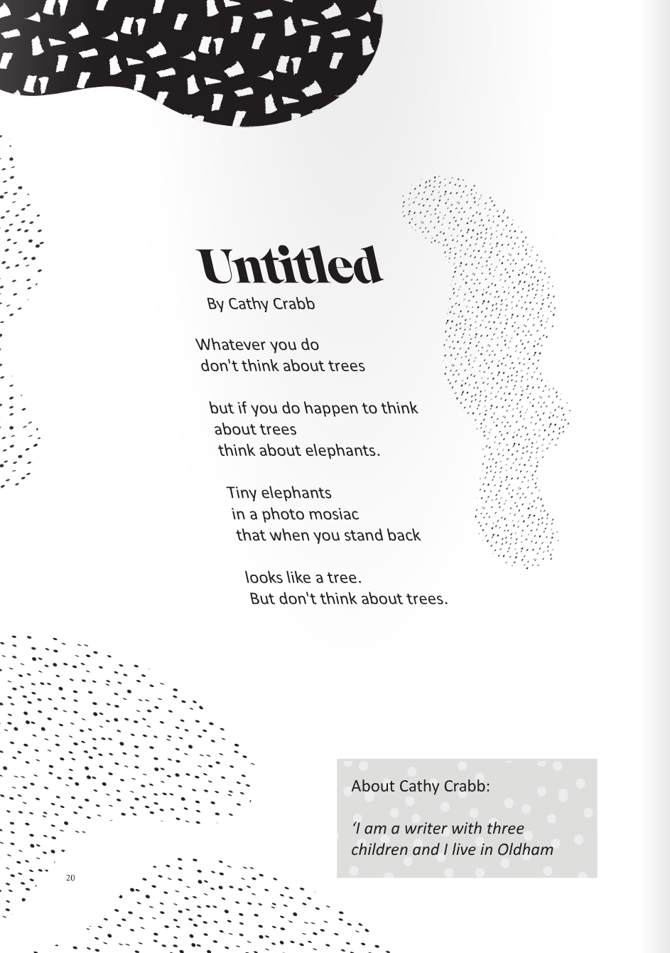 Day 10 of our run of Zine 2 submission posts features poetry by writer Cathy Crabb. Cathy lives in Oldham with her three children. Thank you Cathy, really like your style of the piece you’ve submitted to the DoS zine.