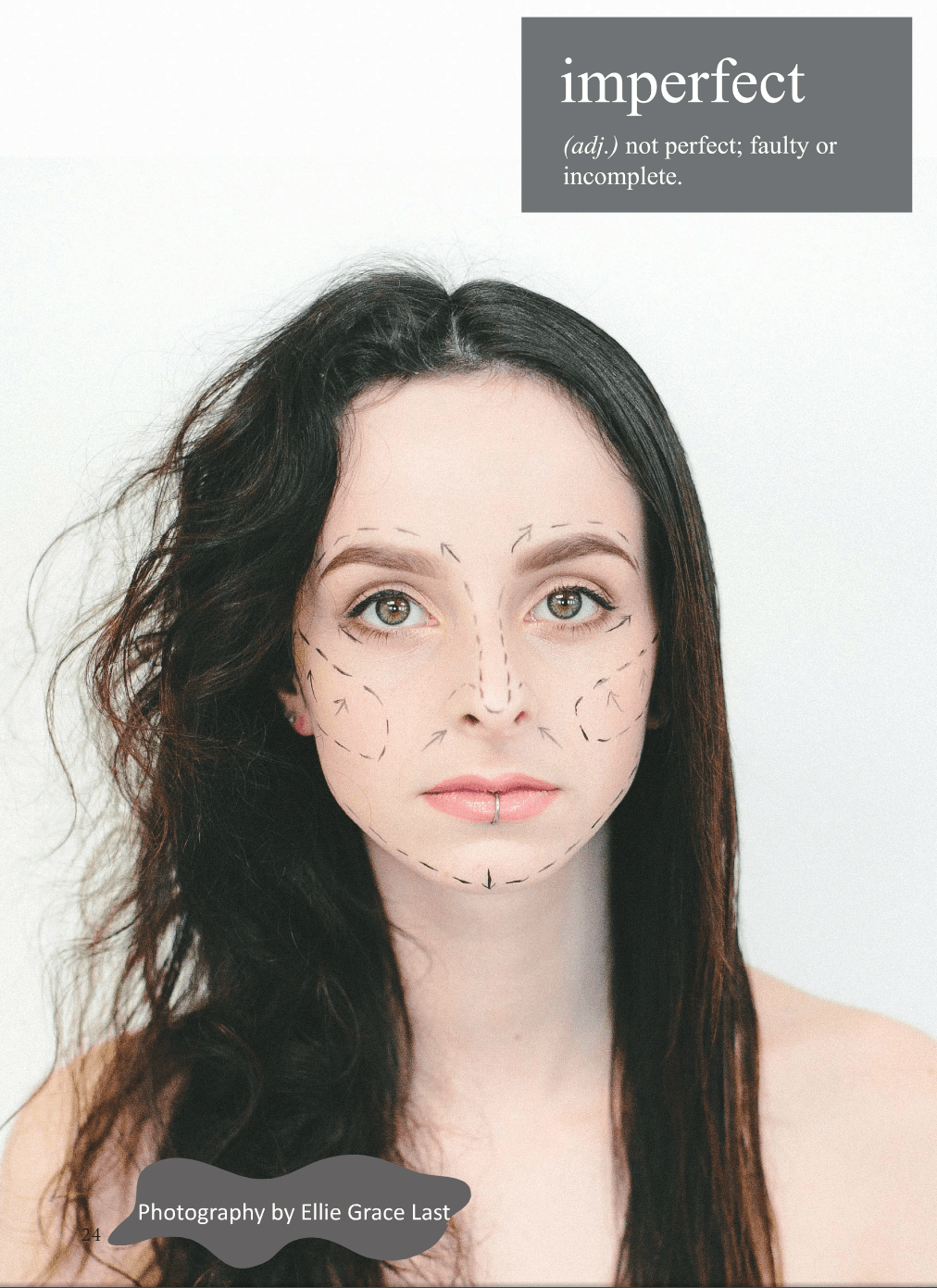 This photo in tackles the concept of imperfection. Directly interpreting the word ‘imperfect’. I think it can apply to so many ways that we see, think and feel, self reflectively, but also looking outwardly. It’s a word a lot of us are all too familiar with. But what is perfect? Maybe nothing is ‘perfect’, our imperfections are what make us brilliant and different to one another. It’s really good to be imperfect – in my personal opinion. There is so much pressure to project the ‘perfect’ image of ourselves, whatever that may be, and pressure to live vicariously through social media. Unfortunately this pressure is in part responsible for the rise in reported mental health problems in young girls and the rise in suicide. Anonymous bullying and ‘trolling’ is social media’s ugly tag-along, it seems easy to make people feel imperfections are not accepted in society.