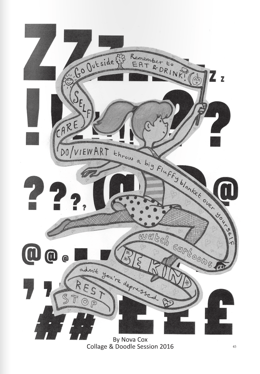 Nova’s work here is a really brilliant expression of self help. She created a positive collage, offering her wonderful advice. She’s one of those amazing people who is always up to something interesting, and is herself interesting and great company. It’s often hard to flip things and see things positively – but when you’re next feeling good – start to write some of the things that you are doing or things that you would like to do, which might make you more inclined to go out and do them. I really struggle without a routine, really badly, and sometime the thought of getting my diary out when i’m in a bit of a hole is really hard work, alongside answering texts! So it’s important not to overface yourself with too much. Self care is the key.